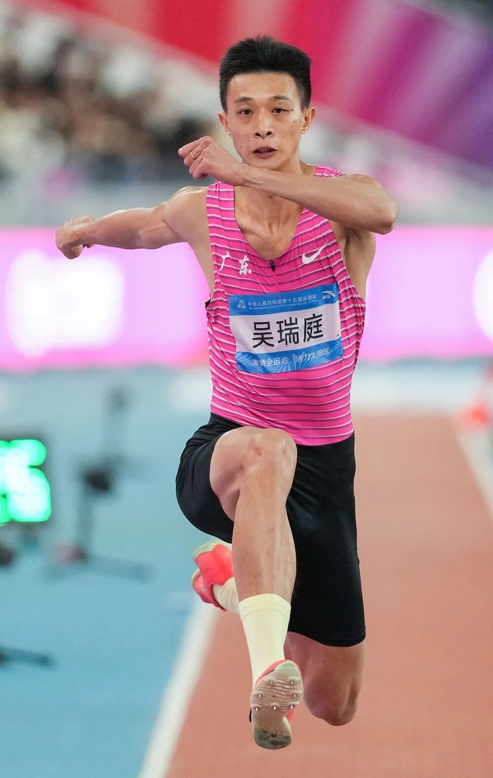 11月20日,广东队选手吴瑞庭在第十五届天下灵通会田径形式须眉三级跳远决赛中。他得到冠军。图/新华社