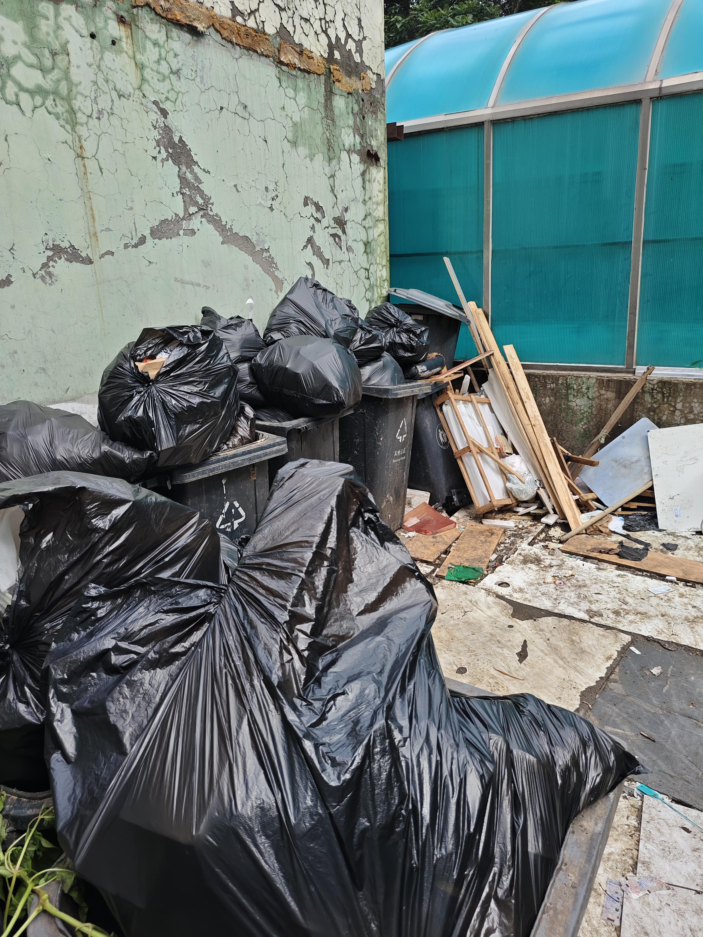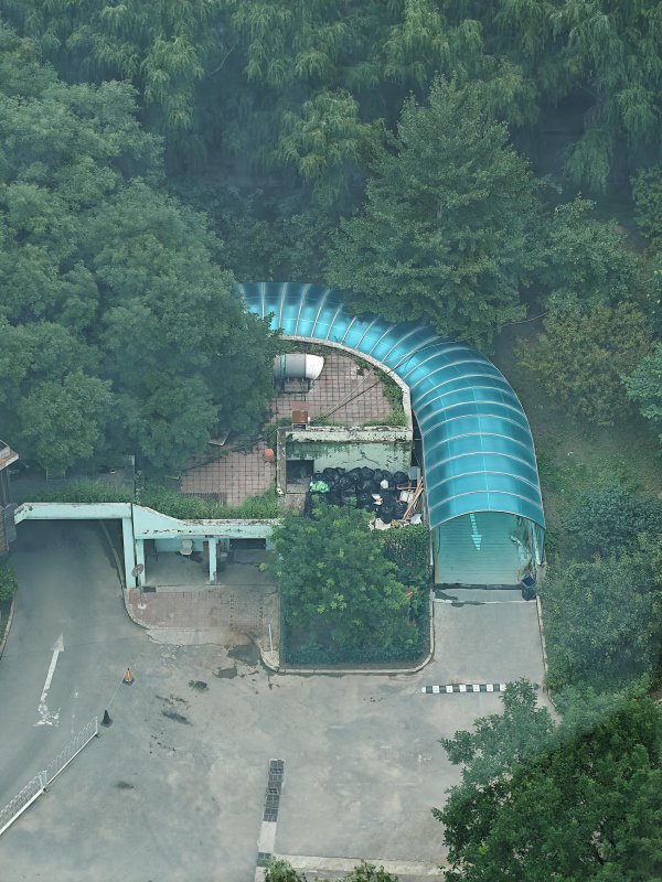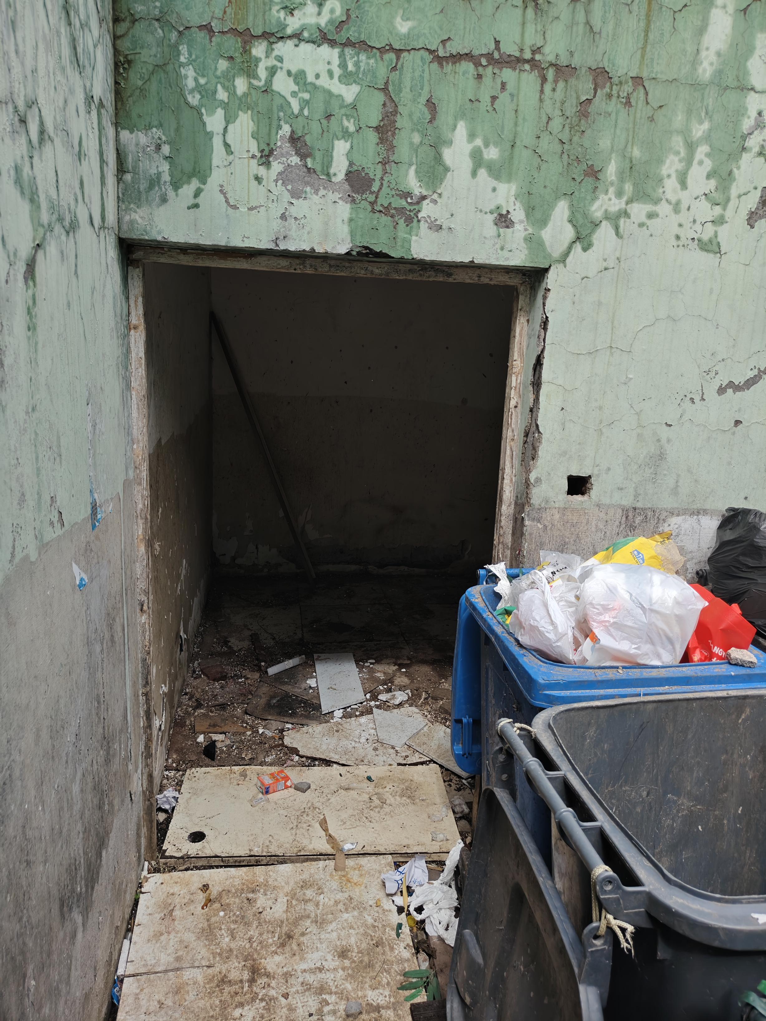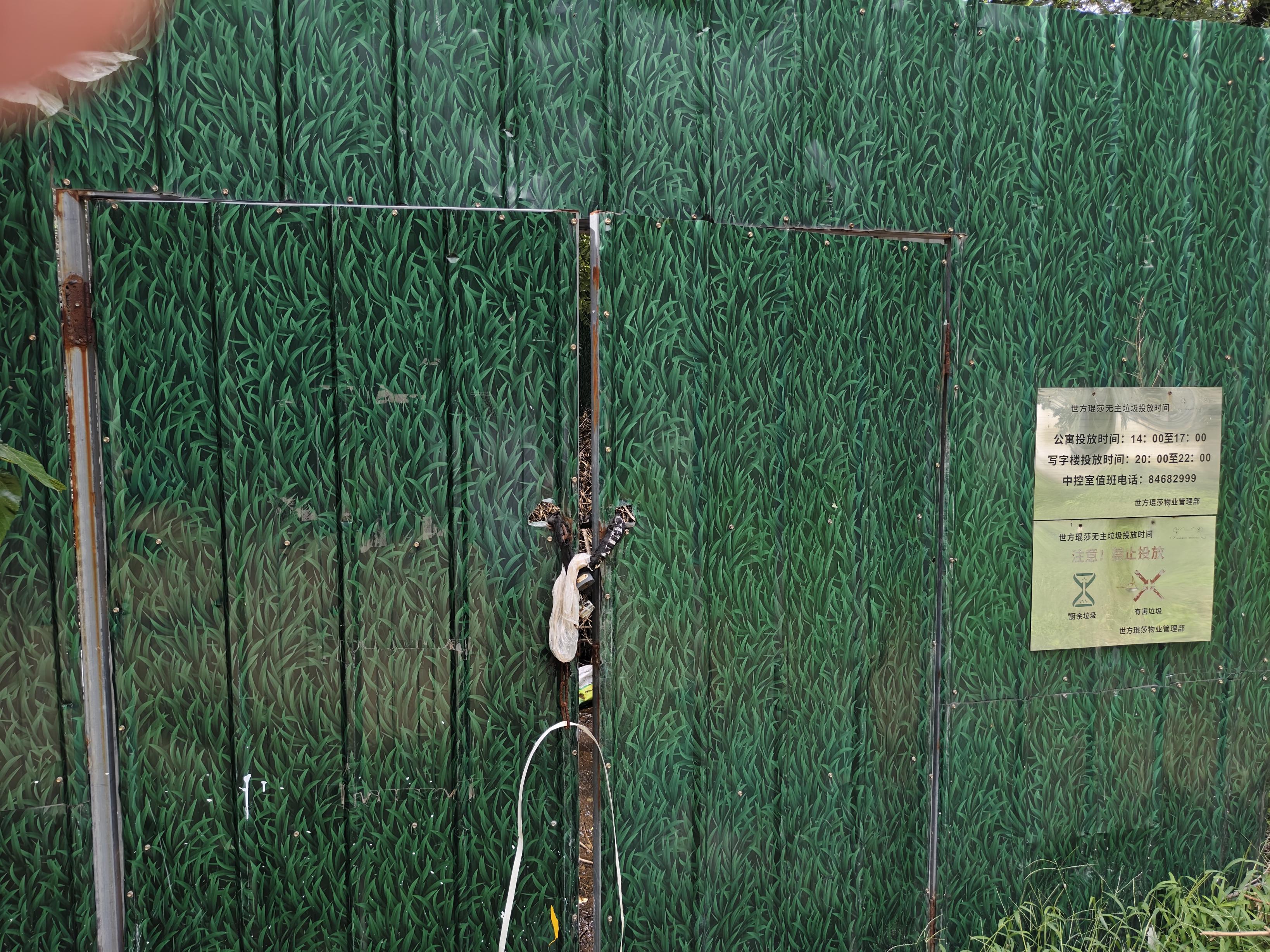 从小区楼上不错了了地看到东说念主防出口处的垃圾桶和垃圾袋,以及垃圾桶前边的假竹子