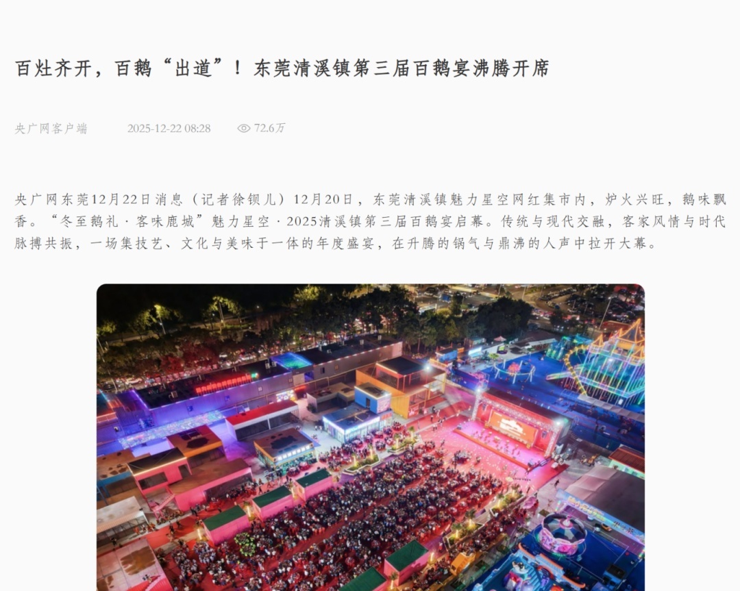 央广网也推出图文报说念《百灶皆开,百鹅“出说念”!东莞清溪镇第三届百鹅宴欢畅开席》,灵活再现盛宴现场。